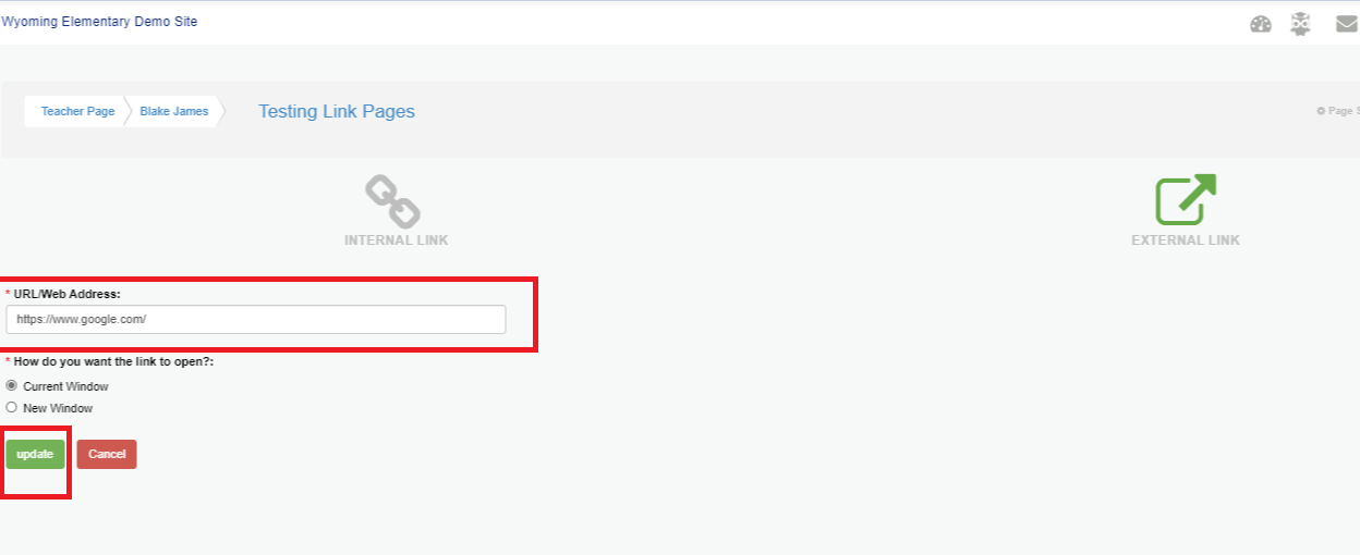 Be sure to choose how you want the link to open and click the green "Update" button.