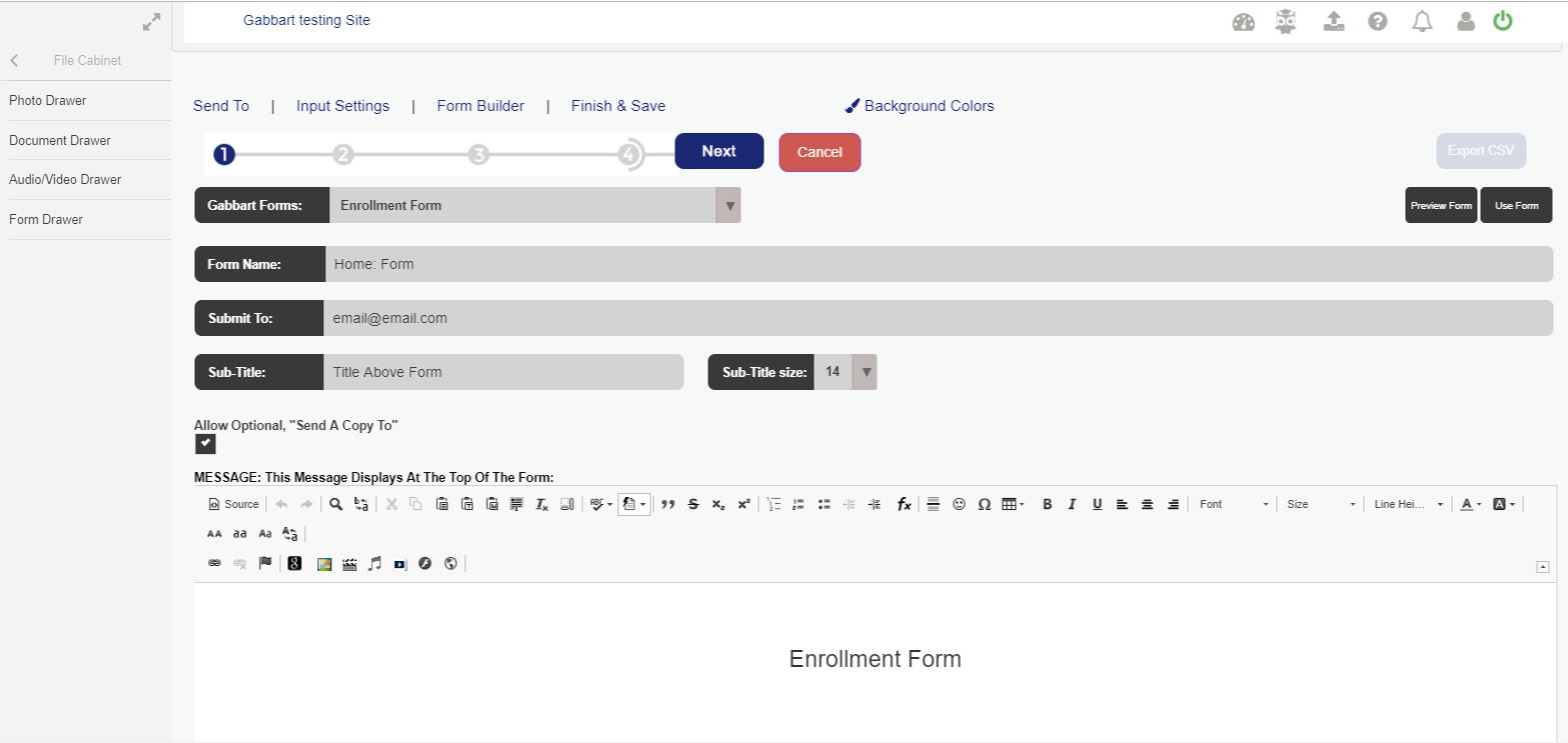 To create a new form you will go to your File Cabinet and select your Form Drawer. In this section you can simply input the title of your Form and select 'Create Form'.
