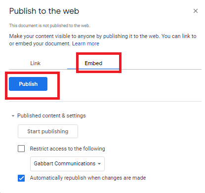 2. In the window that pops up click Embed then click the "Published Content and Settings" to make sure the document is set to automatically update. when you are ready click the blue Publish button.
